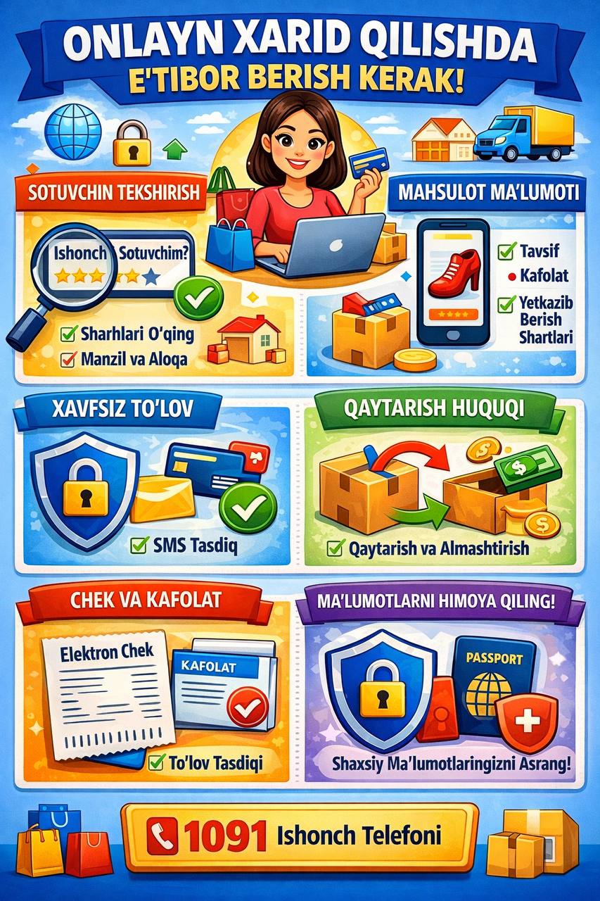 Bugungi kunda onlayn savdo kundalik hayotimizning ajralmas qismiga aylandi. Internet orqali xarid qilish qulay va tezkor bo‘lsa-da, iste’molchi ayrim muhim jihatlarga e’tibor qaratmasa, moliyaviy zarar yoki sifatsiz mahsulot muammosiga duch kelishi mumkin. Quyida onlayn savdo jarayonida e’tibor berilishi lozim bo‘lgan asosiy masalalar keltiriladi.