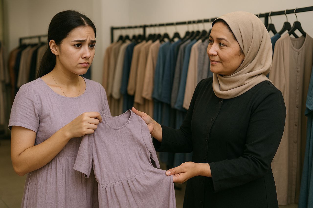 Fuqaro S.T. Qo‘ng‘irot tumani bozoridan ayoli uchun 280 ming so‘mga ko‘ylak sotib olgan, biroq uyga borib kiyib ko‘rgandan so‘ng o‘lchami to‘g‘ri kelmay qolgan. Yuzaga kelgan holat bo‘yicha fuqaro tovarni do‘konga qayta olib borgan. Biroq, sotuvchi iste’molchining to‘lovini qaytarib berishdan bosh tortgan.